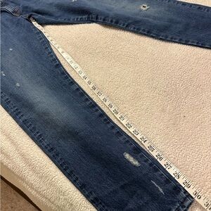 5 pocket styling, zip entry, factory fading & distressing throughout.