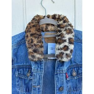 Cute denim jacket by Levi's with a leopard print fuzzy collar and plenty of pockets! Button closure. Long sleeve. Two chest pockets, two side pockets. Cotton. General wear from washing but no stains, rips, etc. Super cute denim coat with on trend animal print collar!