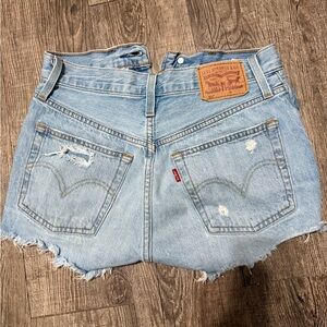 Stylish Levi's jean shorts with a distressed look. Light blue denim for a casual vibe. Perfect for summer outings.