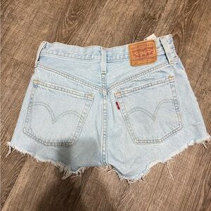 Trendy light blue jean shorts with frayed edges. Features a button-up front and distressed details. Perfect for casual wear.