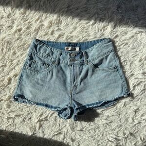 Levi’s light wash denim cutoff shorts. Very unique with double buttons details. Shorty short size tagged kids 14 regular. It fits me well as a size 0/25, can comfortably fit 00/24. Almost brand new condition!