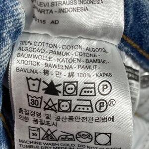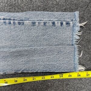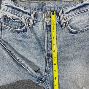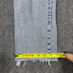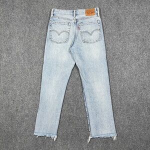 Classic Levi's straight leg jeans. Light blue denim. Distressed details. Frayed hem.