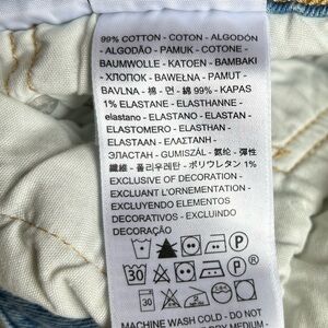 * Measurements (lay flat, approx): waist: 14”; rise: 10.75”; inseam: 27.75”.