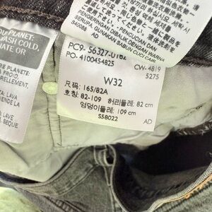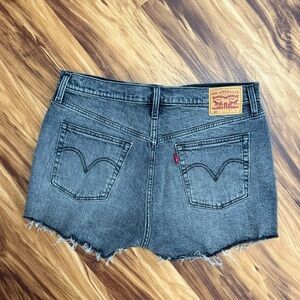 These Levi's jean shorts feature a stylish distressed look with frayed hems, perfect for a casual summer vibe. Made from blackish gray denim, they offer a comfortable fit and a trendy, worn-in appearance.