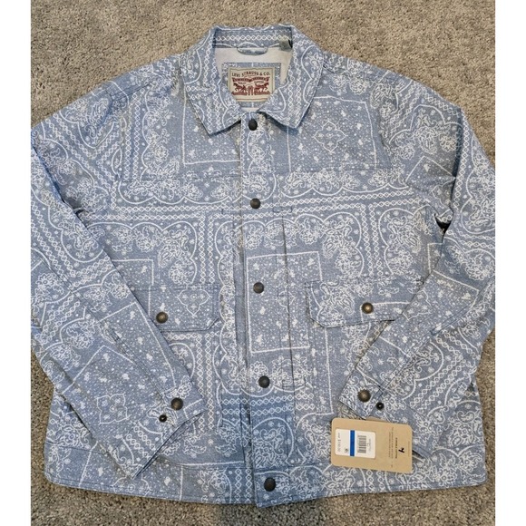 The Levi's Lightweight Trucker Shirt Jacket in light blue denim is a stylish and versatile outerwear piece perfect for casual occasions. Made from cotton denim with a quilting accent, this mid-length jacket features a zip, button, and snap closure. The paisley pattern adds a touch of interest while the lightweight design makes it ideal for layering in winter, fall, and spring. Perfect for travel, parties, or everyday wear, this Levi's Trucker Jacket in men's size XL offers a comfortable and fashionable option for the modern man.