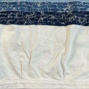 Features a unique "Love Letter" multi-wash blue denim detailing across the chest and sleeves, creating a beautiful textured fringe effect.