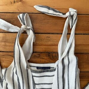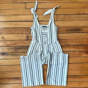 Linen blend jumpsuit perfect for the warmer days/chilly nights. Cutout in front. Adjustable straps. Side zipper. Pockets!! Some pulls on the fabric, as shown in photo