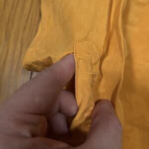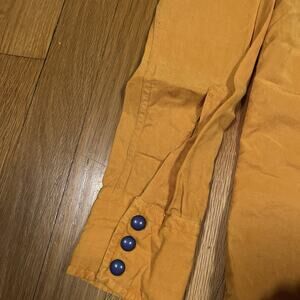 Great unique Levi’s Made and Crafted piece, vibrant yellow snap shirt with blue snap button and bird embroidery on the front and the back. However note both sleeves have some undone stitching near the cuff as documented in photos but does not affect the aesthetic that drastically. Tagged Size 1 and made in Romania, missing wash tag. See pictures for details and measurements. Orders ship out on Monday, Wednesday, and Friday.