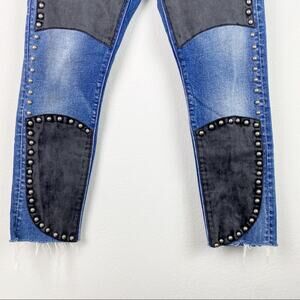 A studded construction with unique, contrast front panels makes these jeans bold and chic