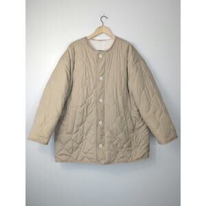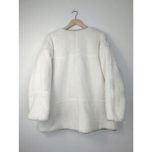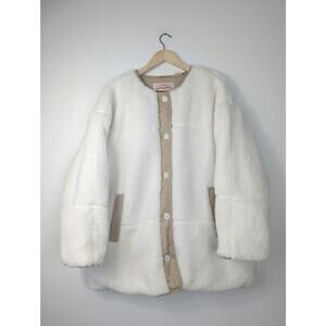 Levi's Marlowe Oversized Reversible Sherpa Jacket in Coconut Milk. Buttons in front and slanted pockets on both sides. Has extra button on material tag.