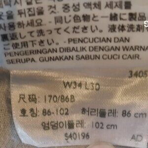 Waist measures 34 inches around. Inseam is 30 inches long.