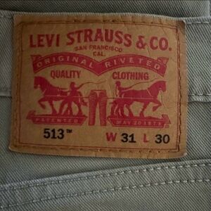 These Levi's 513 Slim Straight Pants in a tan camel beige come in button-zip fly, belt loop. Approximate flat measurements; length 41", waist 16", rise 1.5", inseam 29.5", hips 19.5"