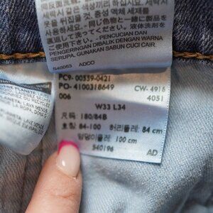 Minor wear on hems and pockets but does not affect overall look. Waist = 33 inches, Inseam = 34 inches.