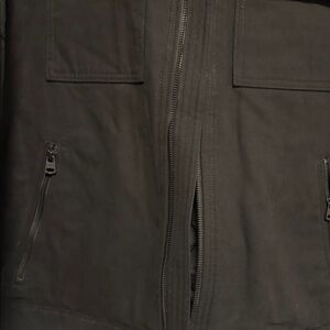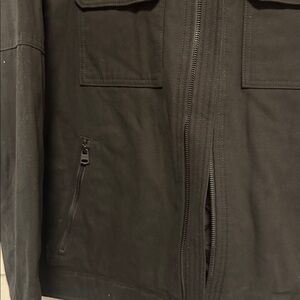 Sleek black design. Front button pockets. Zip closure. Perfect for layering.