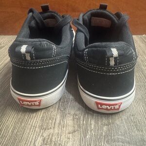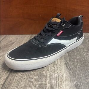 Stylish Levi's sneakers with a modern look. Black upper with white accents. Comfortable and versatile for daily wear.