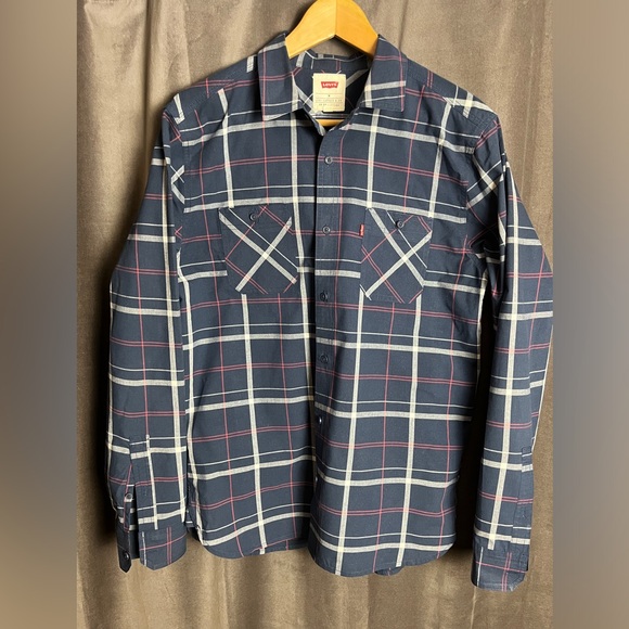 Classic Levi's shirt with a blue and red plaid pattern. Perfect for layering and casual wear.
