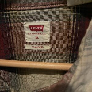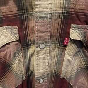 Levi's plaid shirt jacket in burgundy and cream. Lightweight and stylish. Perfect for layering. Western shirt with pearl snaps.