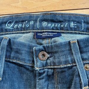 The Levi's Men's Capital E Stacked Skinny Jeans in size 34 waist and extra long length offer a slim fit designed for a modern style. Made from denim fabric with a mid-rise, these jeans feature a classic 5-pocket design and button/zipper closure. The blue color, solid pattern, and logo accents give them a timeless appeal, while the slimming features make them a versatile choice for any season. Proudly made in the USA as part of the Levi's Capital E product line, these jeans are machine washable for easy care.
