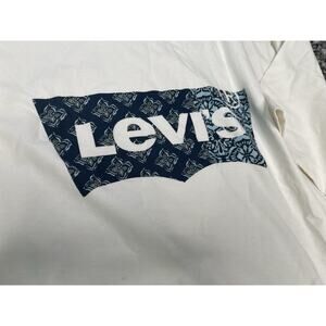 The product is a classic graphic t-shirt for men by Levi's in a standard size large with a tan color and blue logo. Made from 100% cotton knit fabric, this short sleeve shirt features a round neckline and is machine washable. It is suitable for all seasons, particularly summer, fall, and spring, and has a regular fit and design. The vintage and personalized elements are not present, making it a timeless and simple addition to any man's wardrobe.