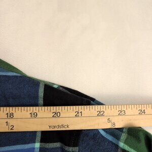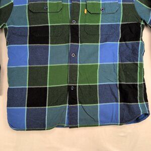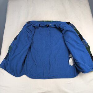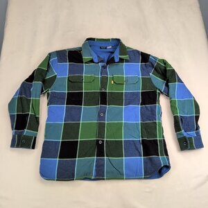 Levi's men's fleece-lined plaid shirt jacket in size M. Lightweight overshirt design with cozy fleece interior for added warmth. Button-front closure, two chest flap pockets with buttons, button cuffs, and Levi's gold tab at the left pocket. Large blue, green, and black plaid pattern versatile layering piece for cooler days.