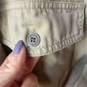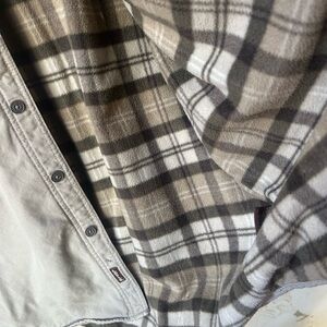 Stay warm and stylish with this Levi’s men’s shacket in a versatile stone color. The heavy cotton canvas outer and plaid fleece lining make it perfect for layering on cool days. Classic button-front design with metal Levi’s buttons and two chest pockets adds timeless style.