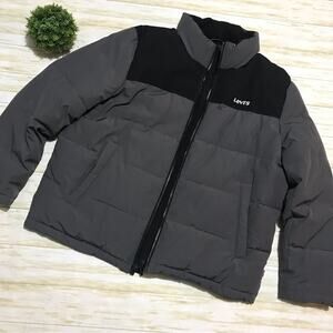 Stylish Levi's puffer with a vibrant green and blue design. Ideal for casual wear.