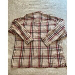 Good pre-owned condition. Flaws button missing on the sleeve but there is an extra button. There are stains, see last few pictures. Vintage. Great work shirt. Tan/beige, red, yellow, black. Oversized, baggy, grunge. Quick shipping. Thanks for looking! Measurements chest 24 1/2 flat, length 31.