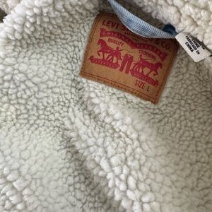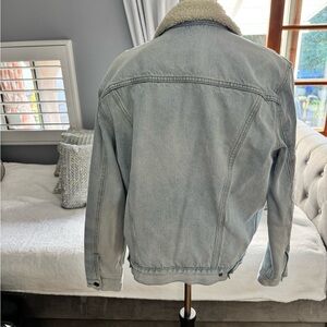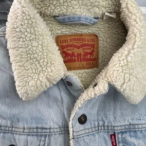 Classic Levi's denim jacket in light blue. Features a cream sherpa collar. Ideal for layering.