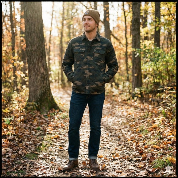 Merge workwear durability with modern streetwear aesthetics in this Levi's Diamond Quilted Shirt Jacket. Featuring a classic woodland camouflage print on a 100% cotton shell, this "shacket" is the perfect insulated layering piece for transitional weather or cooler days outdoors. It features a unique dual-closure system with a heavy-duty brass zipper hidden beneath a button placket for maximum warmth.