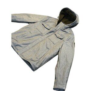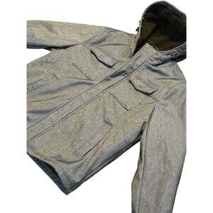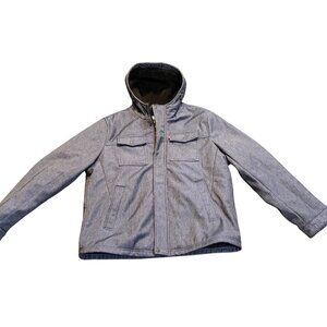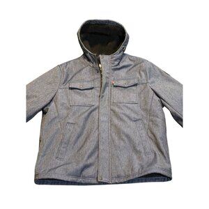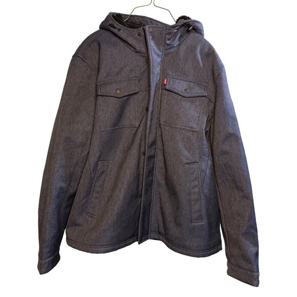Levi's hooded jacket, gray sherpa jacket, men's winter jacket, XL Levi's coat, outdoor jacket, warm hooded coat, casual men's jacket, gray Levi's jacket, Levi's winter wear, Levi's pocket jacket, Levi's warm coat, Levi's sherpa-lined jacket, men's hooded outerwear