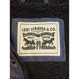 This hooded Levi's jacket features a soft sherpa lining for warmth and comfort. Designed with multiple pockets and durable fabric, it suits casual or outdoor wear.