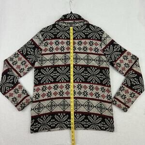 This Levi’s men’s sweater jacket in size Medium features a bold Nordic Fair Isle snowflake pattern in black, gray, and red. Designed with a button front closure, notch lapel collar, and front slip pockets, it combines the warmth of a sweater with the structure of a casual blazer. Made from 100% polyester for softness and durability. Perfect for winter layering, holiday gatherings, or casual outings.