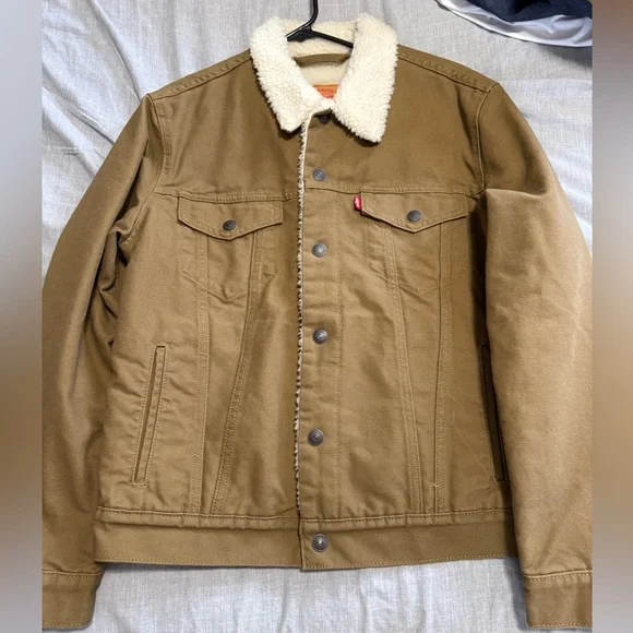 Classic Levi's jacket with sherpa collar. Tan color. Button-front closure. Ideal for layering. Never been washed, honestly I only put it on once for a selfie didn’t wear it around at all.