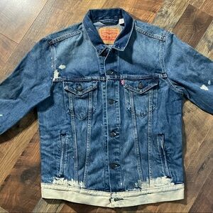 Elevate your casual style with this unique Levi’s Trucker Jacket in the "Baez" wash. This isn't your standard denim—it features intentional heavy bleach distressing at the hem and cuffs, giving it a lived-in, custom-made look.