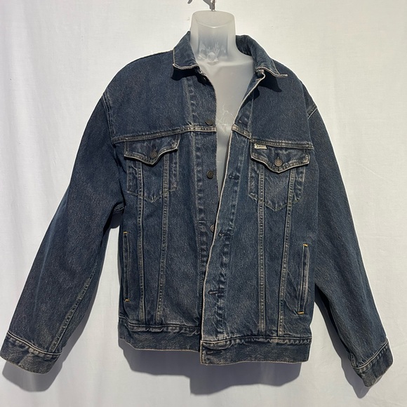 Classic Levi’s denim trucker jacket in dark wash. Button‑front, chest flap pockets, relaxed fit — timeless piece that pairs with anything. Great casual layering piece.