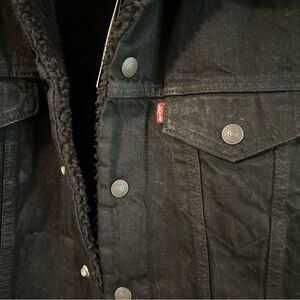 Stay warm with Levi's black sherpa-lined jacket. Classic design with button closure. Perfect for layering.