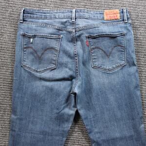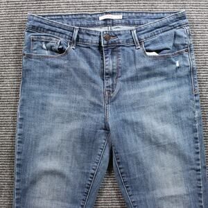 Soft and stretchy Levi’s women’s mid rise skinny jeans in a versatile medium blue wash with subtle fading. Tag size is W32 L32, but the hems have been cut for an on-trend cropped raw-hem look, now measuring about a 26" inseam—great with sneakers, sandals, or ankle boots. A bit of light distressing at the pockets adds casual character while the mid rise and skinny leg keep the fit flattering. Color may vary slightly from photos due to lighting and monitor settings.
