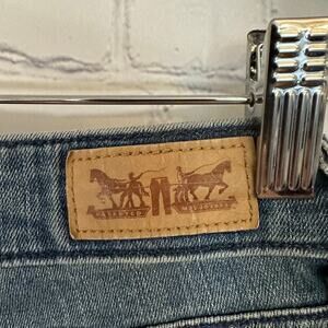 These Levi's mid rise skinny jeans have Aztec / Southwestern-inspired tuxedo stripe embroidery detail in pale blue and pink down the side of each leg. They are a lighter wash and are slightly distressed throughout.