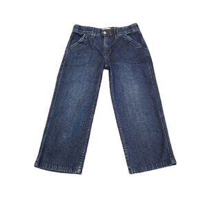 Dark rinse stonewashed straight leg cropped jeans. Mid-rise. Single button and zipper front closure. Elastic waistband. Matching blue threading. Four pockets.