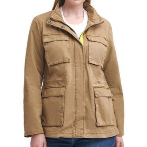 New With Tag Levi's Cotton Twill Stand Collar Military Jacket Rugged and chic, Levi's combines utilitarian style with a pop of color on this heavily pocketed look, a military jacket in durable cotton twill. Adjustable snap cuffs Drawcord at inner waist Contrast tape detail at front zipper Red tab at left chest pocket Lined Stand collar with faux zipper detail; front placket with hidden zipper and snap closures Two chest flap pockets with snap closures; two lower flap pockets with snap closures Khaki / Lime yellow Cotton; lining: polyester Machine wash #755/725a