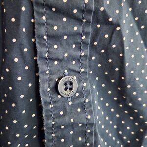 This is a modern fit short sleeved button-down shirt by Levi's. It is navy blue with small white polka dots. There is a pocket on the chest and extra buttons sewn on to the inner tag. 100% cotton Pit to pit: 20" Length: 26.5"