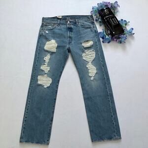 NWOT. 501 Light Wash Distressed Straight Jeans for Men Size 36 x 32. Buttons for closure, 5 pockets design, has loops. As per tag it is "100% cotton, sits at waist". Pictures are part of description.