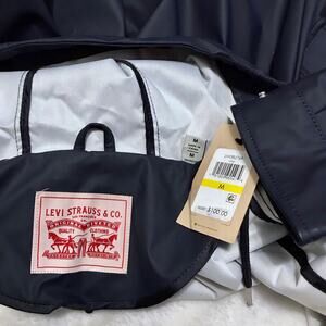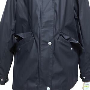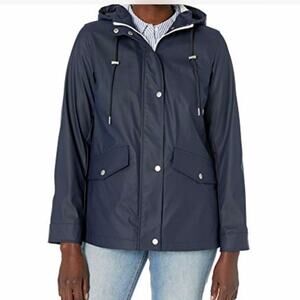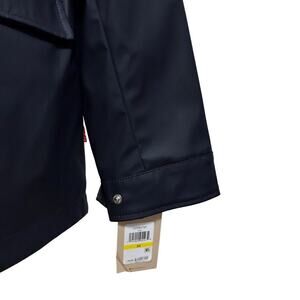 NWT. Navy Rain Jacket for Women Size M. Zipper and snap button for closure, long sleeves with 2 snap buttons for adjustments, non removable hoodie with adjustable strap and toggles, 2 front pockets with snap buttons to close, middle back overlap style. Black bandeau and necklace are not included. Pictures are part of description.