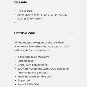STYLISH FEATURES: Sherpa trim details, Sherpa lined collar, cuffs and hem, FUNCTIONALITY: Center front zip closure with snap button overlay, Two oversized lower pockets. WARMING FEATURES: Sherpa interior provides added warmth, Water-resistant outer shell.”