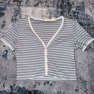This Levi's crop t-shirt features a chic black and white stripe pattern, short sleeves, and a fitted design. The buttoned front adds a touch of elegance to this versatile top, making it a perfect addition to any casual wardrobe.