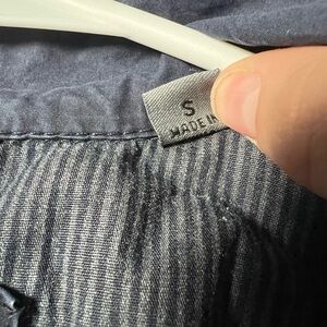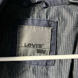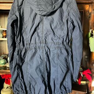 Navy utility jacket with multiple pockets. Features drawstring waist and hood. Perfect for everyday wear.