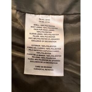 Material: Shell: 100% Polyester, Body Lining: 100% Polyester, Faux Fur Hood Lining: 100% Polyester, Sleeve Lining: 100% Polyester, Filler: 100% Polyester, Knit: 98% Polyester 2% Spandex
