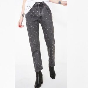 Levi's 501 Original Cropped Jeans. Stretchy. Black / Dark Gray Charcoal Washed Out Distressed Color. Studs / Jeweled Crystal Embellished Style All Over. Cute & Comfy. NWT/ New with Tags. Concealed Button Fly. High Rise. Relaxed Fit. No Stains or Rips.