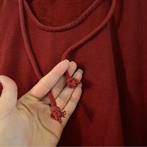 Size medium. Super comfy, cozy, oversized hoodie. Slight scoop in the neckline. Drop shoulder sleeves. Deep red color- put it against the orange mug to show difference in color.