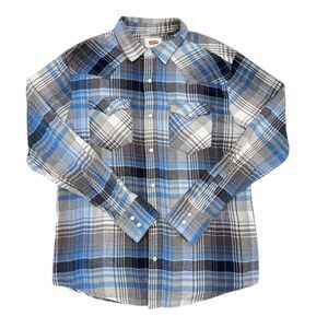 Levis Pearl Snap Button Up Shirt Mens Size Small Blue Plaid Western Rancher